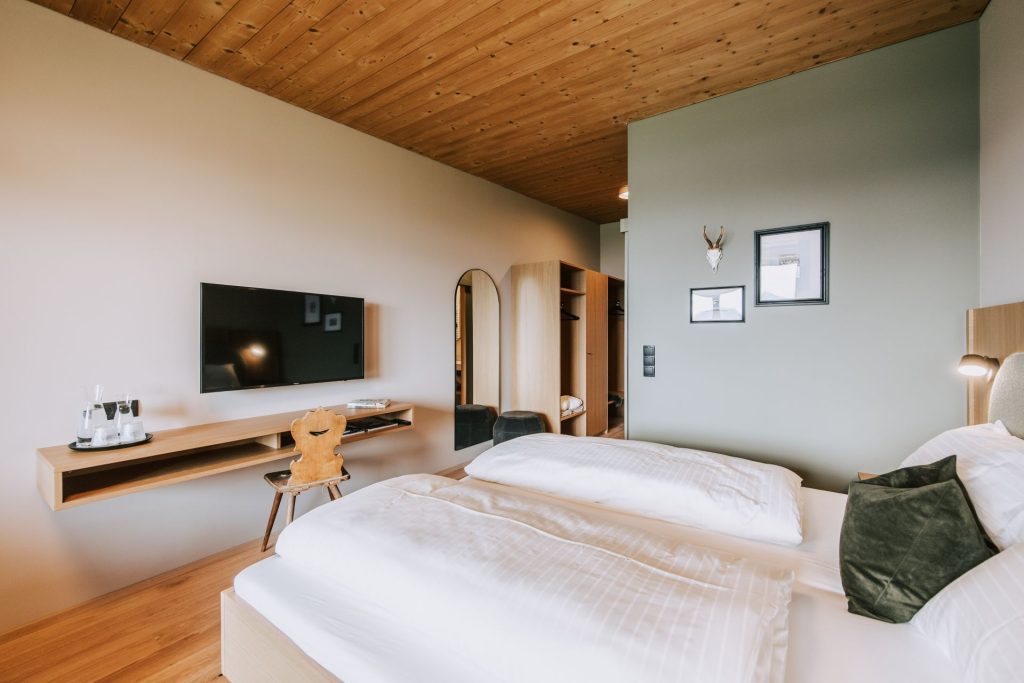 Bregenzerwälder Tradition im modernen Ambiente: Lichtdurchflutete Doppelzimmer mit Balkon und herrlichem Bergblick für authentische Erlebnisse und entspannte Tage.